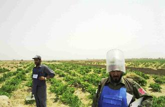 HALO Deminers survey a vineyard that is littered with hundreds of landmines in the Shomali Plains. The gentleman on the left is an eye surgeon who found that he could make a better living removing land mines.