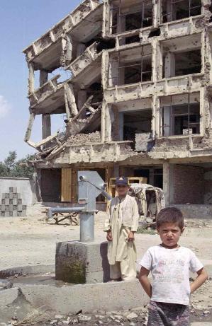 A shell damaged building hangs on to life while two boys enjoy a new water well.